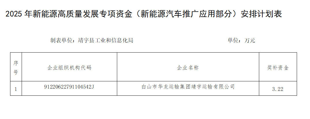 按照《省财政厅关于财政专项资金按进度拨款有关事项的通知》(吉财库函〔2025〕613号)的工作要求以及《2022年及以前年度吉林省新能源汽车推广应用补贴资金分配方案》、《省财政厅关于下达2025年省级工业高质量发展专项资金(新能源汽车推广应用部分)的通知》(吉财产业指)〔2025〕696号)、靖宇县财政局关于拨付2025年省级工业高质量发展专项资金(新能源汽车推广应用部分)的通知》(靖财企指)〔2025〕1291号)文件规定的要求,现将白山市华龙运输集团靖宇运输有限公司获省级新能源汽车推广应用补贴资金3.22万元,予以公示。