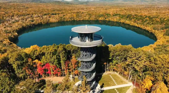 作为典型的火山喷发形成低平火山口湖,四海龙湾玛珥湖拥有独特的地质与生态价值——湖面直径达750米,近乎正圆,海拔791米,水位四季稳定、水质清澈如镜;湖底沉积纹泥被誉为“开启地球迷宫的金钥匙”,记录近10万年古气候变迁;景区森林覆盖率超90%,秋日里红枫、白桦与湖水相映,宛如天然油画。新建成的3公里环湖木栈道蜿蜒其间,游客可沉浸式感受“原生态保护+轻量化开发”模式带来的独特体验,这种开发方式最大限度保留了火山地貌的完整性,实现生态保护与旅游开发的和谐统一。