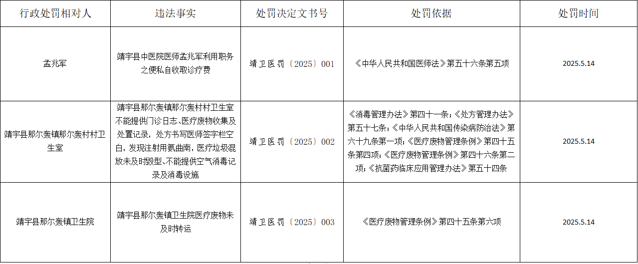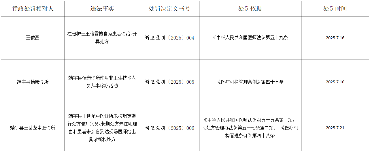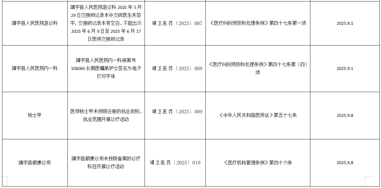 2025年靖宇县卫生健康和医疗保障局行政处罚案件公示