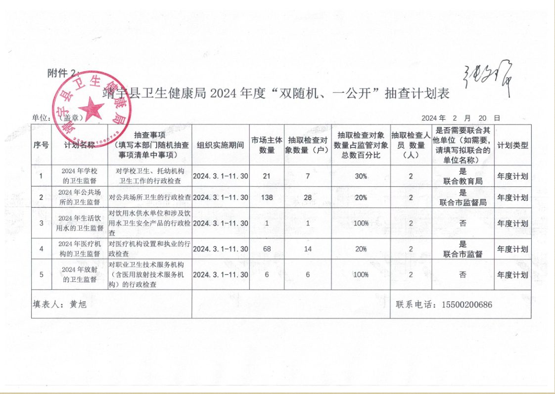 靖宇县卫生健康局2024年“双随机、一公开”抽查计划表